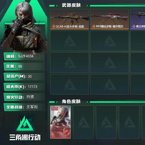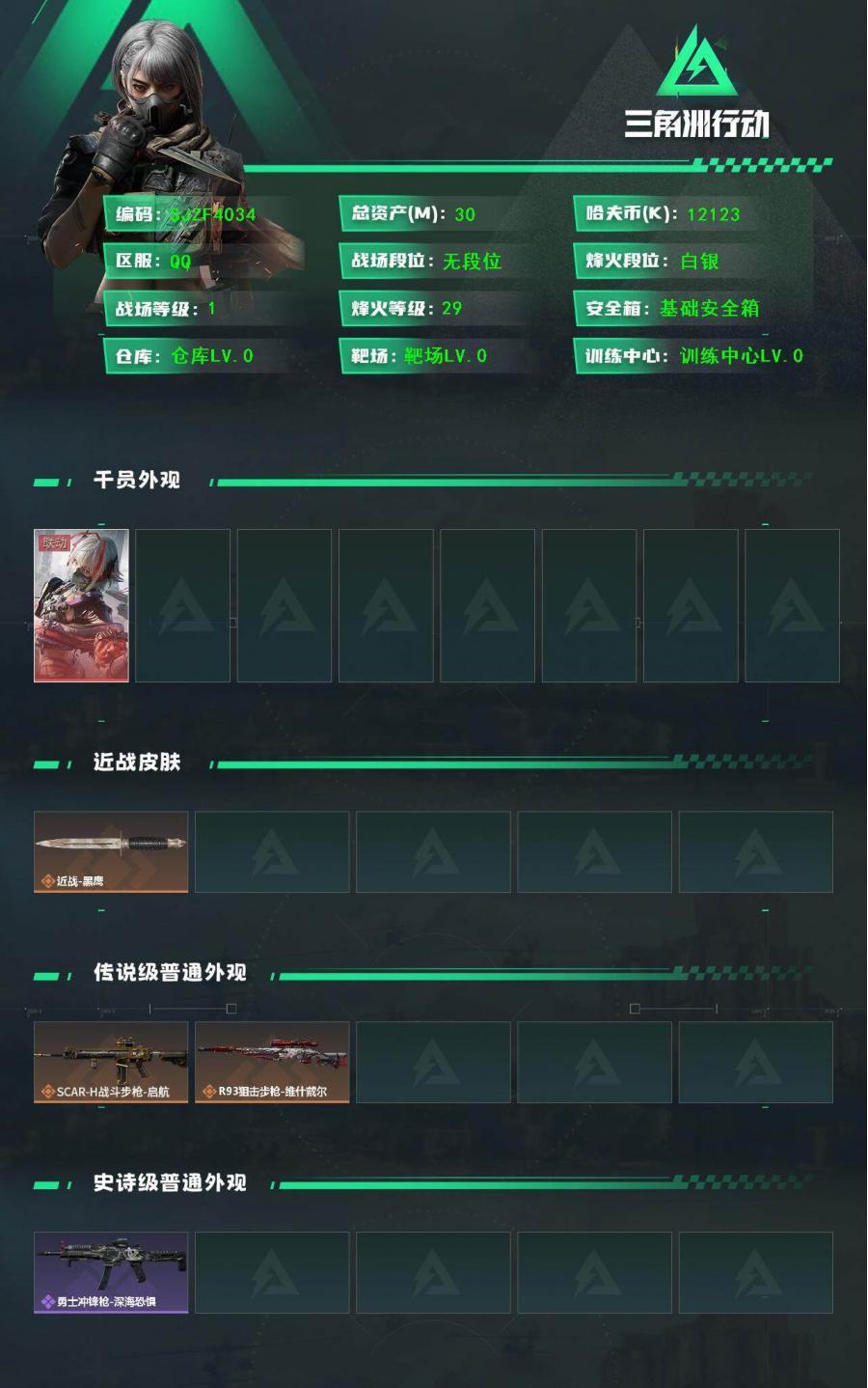 总资产(M):30M/哈夫币(K):12123K/哈夫币(K):12123K/全面战场等级:1_段位:无段位/烽火地带等级:29_段位:白银/骇爪-维什戴尔/黑鹰/SCAR-H战斗步枪-启航/R93狙击步枪-维什戴尔/勇士冲锋枪-深海恐惧/SCAR-H战斗步枪-荣耀列队/Vector冲锋枪-先锋/Mini-14射手步枪-荣耀列队