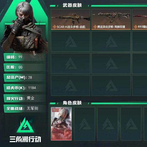 哈伏币-26m流动资产-28烽火等级-黄金-1战场等级-无军衔 【28级27.5m小号】:骇爪-维什戴尔 【近战皮肤】:近战-黑鹰 【传说级普通外观】:SCAR-H战斗步枪-启航,腾龙突击步枪-死神玫瑰,R93狙击步枪-维什戴尔 【史诗级普通外观】:MP5冲锋枪-战术竞备 【稀有级普通外观】