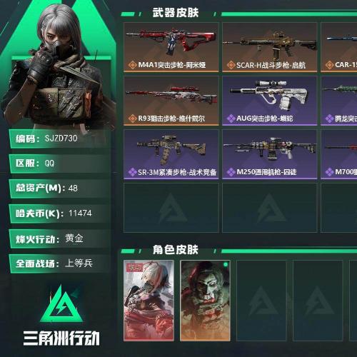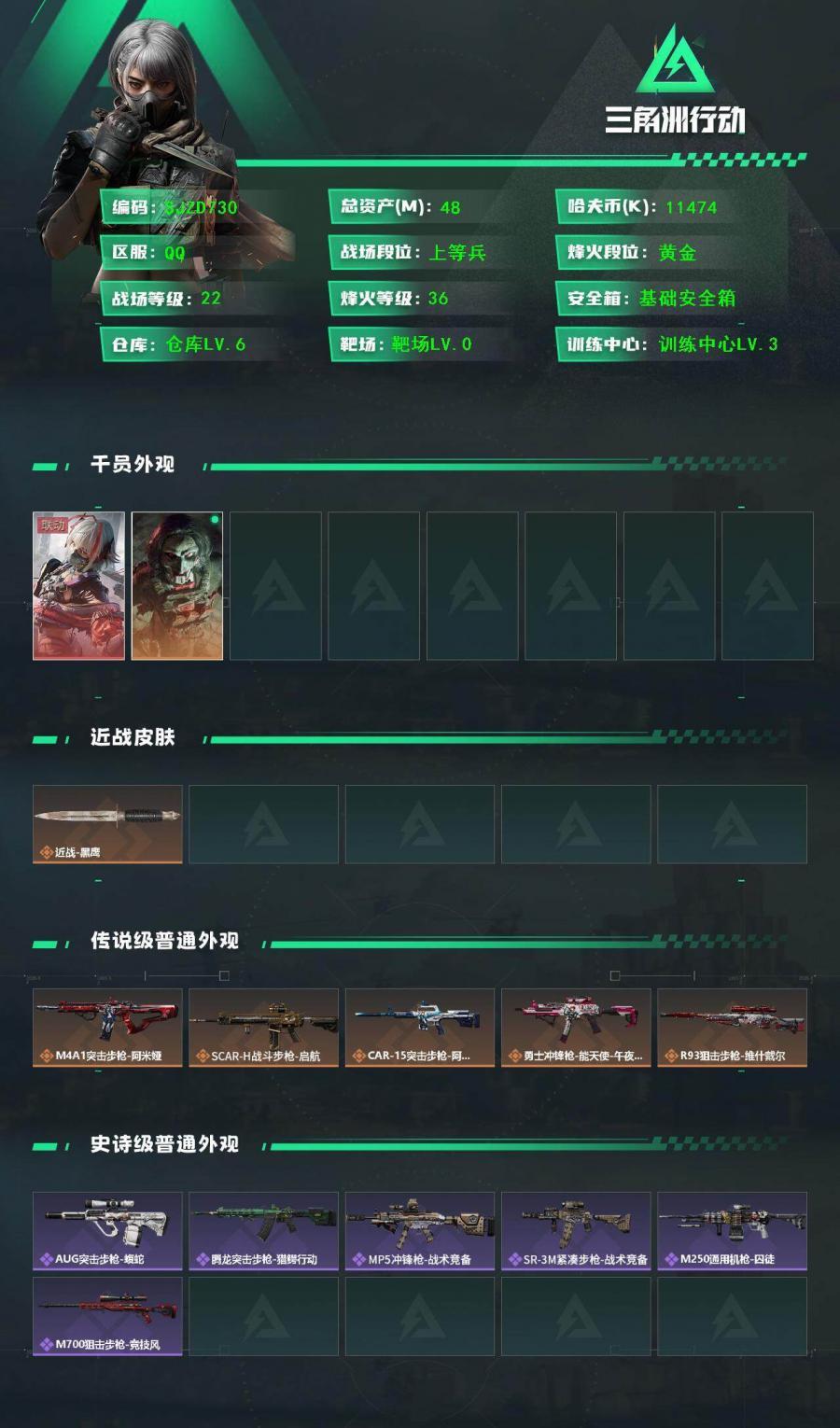 总资产(M):48M/哈夫币(K):11474K/哈夫币(K):11474K/传说枪皮数:6/全面战场等级:22_段位:上等兵/烽火地带等级:36_段位:黄金/骇爪-维什戴尔/红狼-电锯惊魂/黑鹰/M4A1突击步枪-阿米娅/SCAR-H战斗步枪-启航/CAR-15突击步枪-阿米娅/勇士冲锋枪-能天使-午夜邮差/R93狙击步枪-维什戴尔